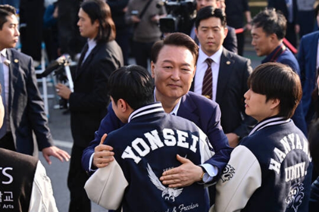 ↑尹錫悦(ユン・ソギョル)さん支持の大学生と抱擁を交わしました。
