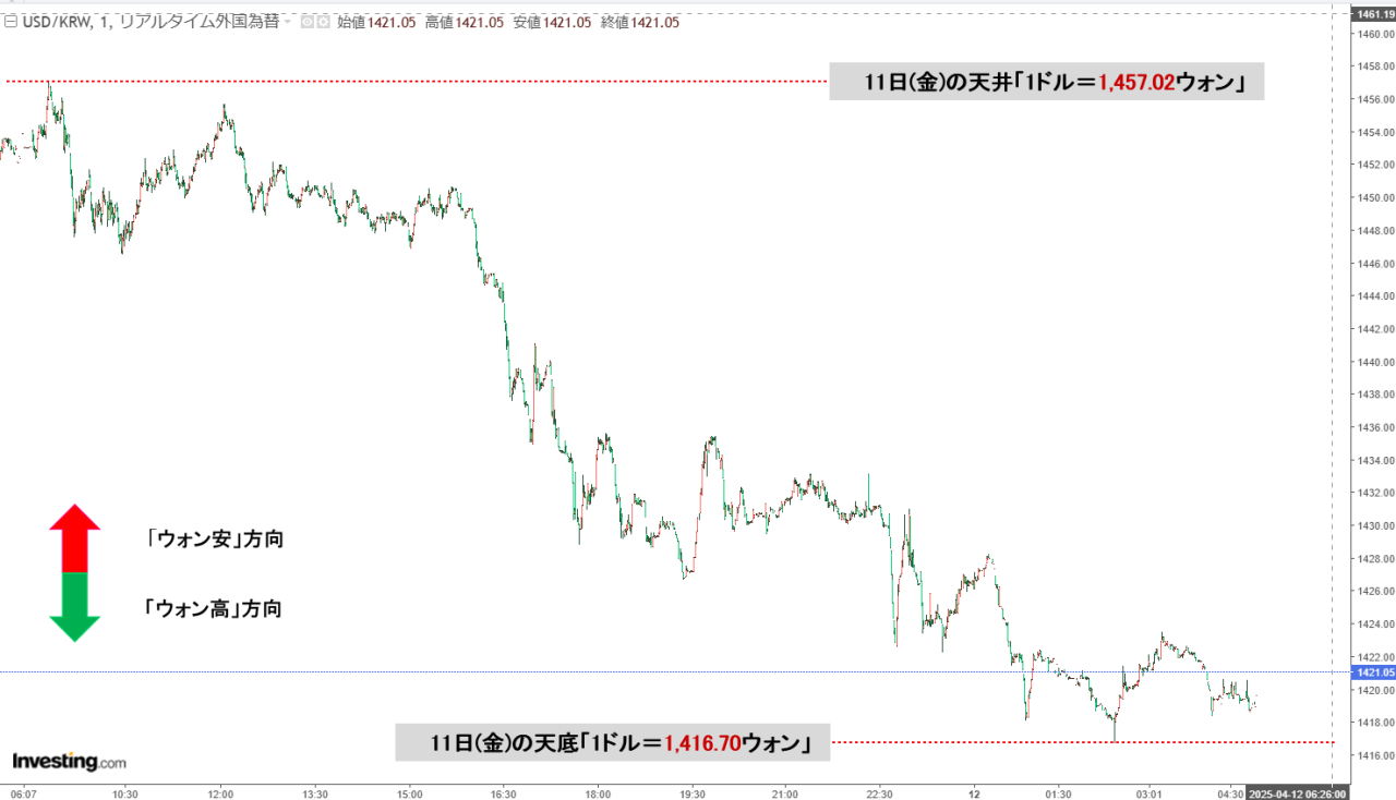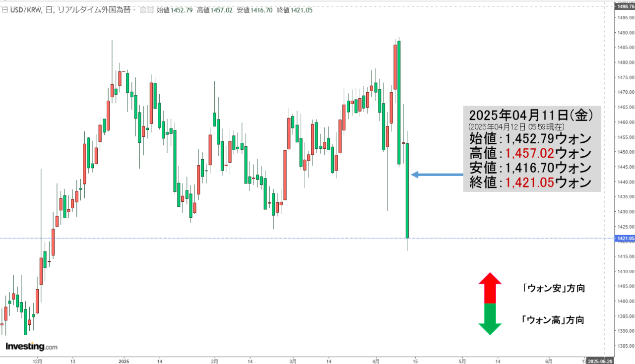 2025年04月11日(金)が(ほぼほぼ)締まりました。2025年04月12日 06:03現在、ドルウォンチャートは以下のようになっています(チャートは『Investing.com』より引用:以下同)。