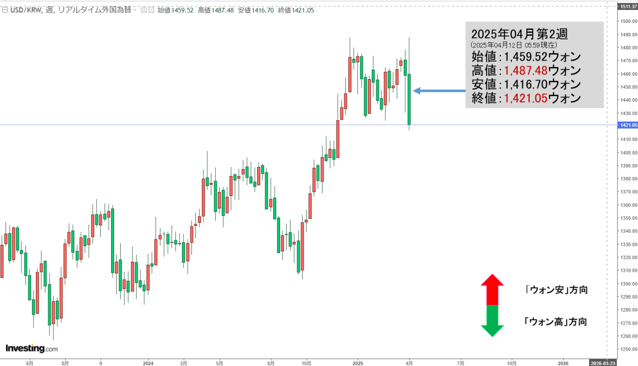 2025年04月14日(月)の市場が開きました。ドルウォンチャートの状況を以下の記事にまとめましたので本記事と併せてお読み頂ければ幸いです。