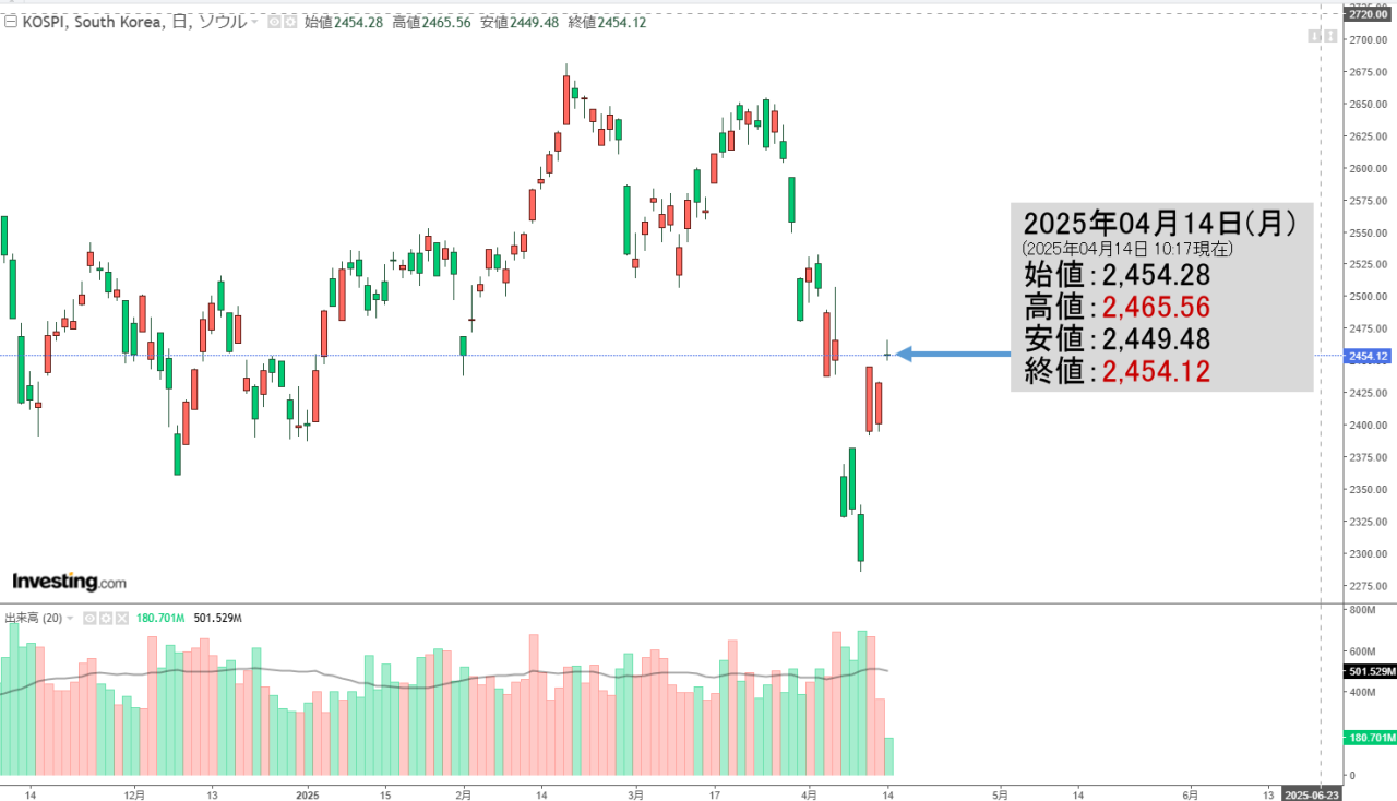 2025年04月14日(月)の韓国株式市場が締まりました。15:44現在、KOSPI(韓国総合株価指数)のチャートは以下のようになっています(チャートは『Investing.com』より引用)。結局コマ足で終わりました。KOSPIは「2,4...