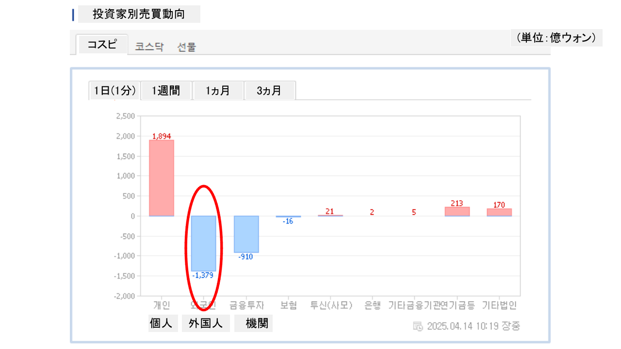 2025年04月14日(月)の韓国株式市場が締まりました。15:40現在、KOSPI(韓国総合株価指数)のチャートは以下のようになっています(チャートは『Investing.com』より引用)。投資家別売買動向は以下です。⇒データ引用元:『…