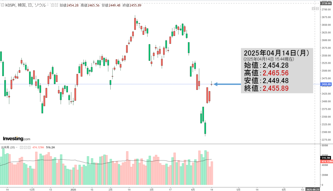 「韓国株式市場」04月15日(火)初動・KOSPI「2,470」