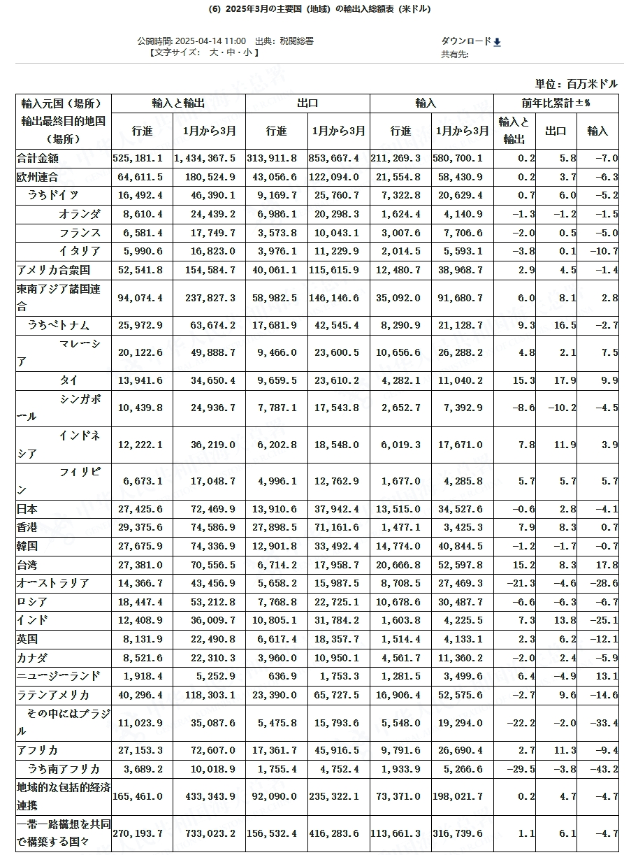 2025年04月14日、中国の海関総署が2025年03月の輸出入実績のデータを公表しました。