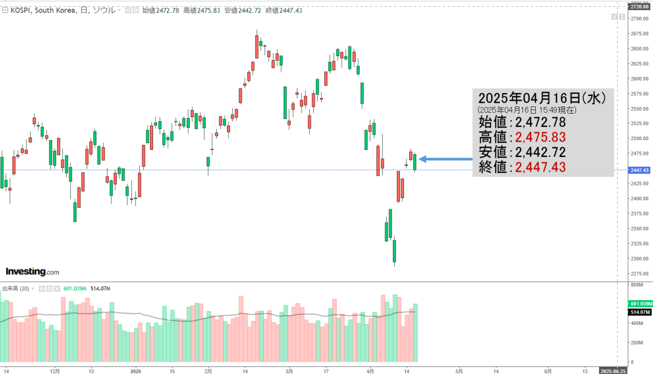 2025年04月16日(水)の韓国株式市場が締まりました。15:49現在、KOSPI(韓国総合株価指数)のチャートは以下のようになっています(チャートは『Investing.com』より引用)。