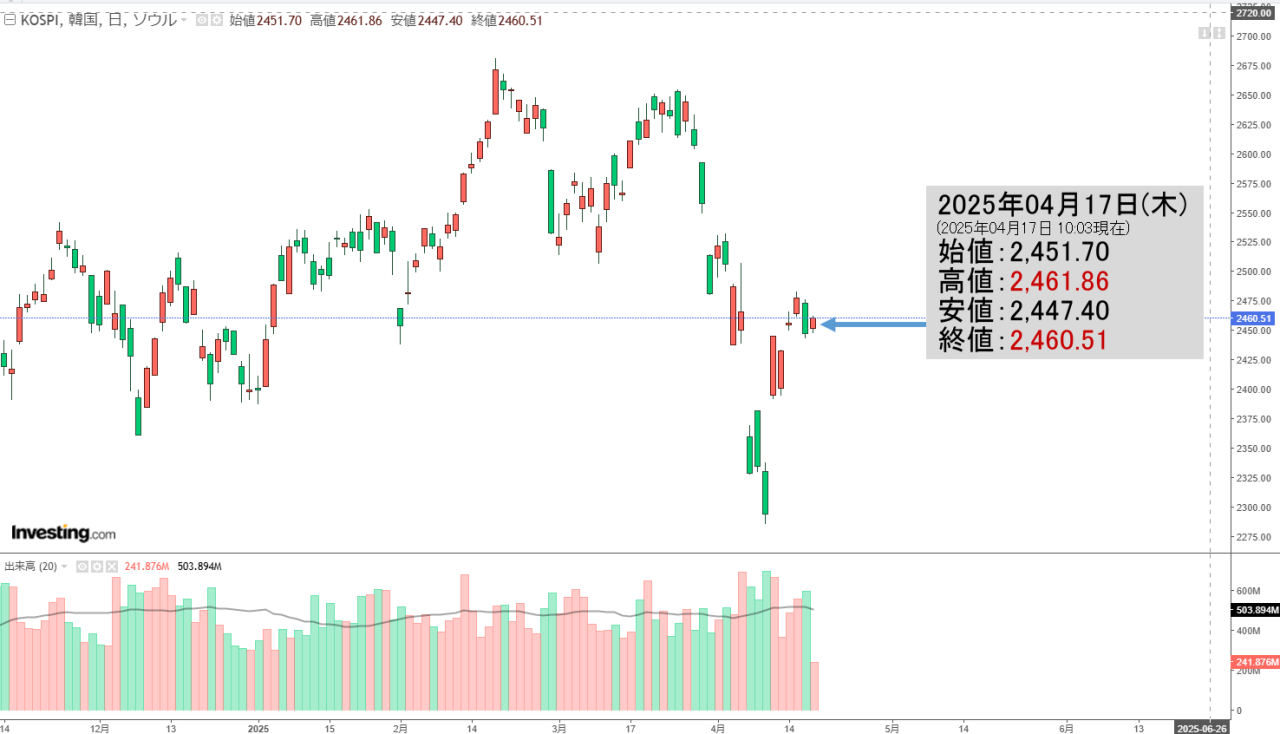 2025年04月17日(木)の韓国株式市場が開きました。10:03現在、KOSPI(韓国総合株価指数)のチャートは以下のようになっています(チャートは『Investing.com』より引用)。
