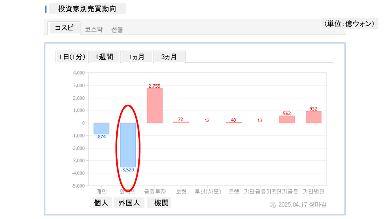 個人投資家は「874億ウォン」の売り越し。一方の外国人投資家は「3,520億ウォン」の売り越しです。