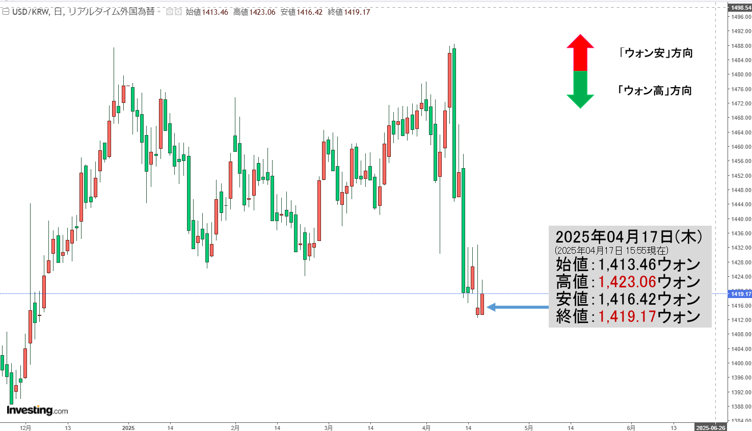 2025年04月17日(木)15:55現在、ドルウォンのチャートは以下のようになっています(チャートは『Investing.com』より引用)。