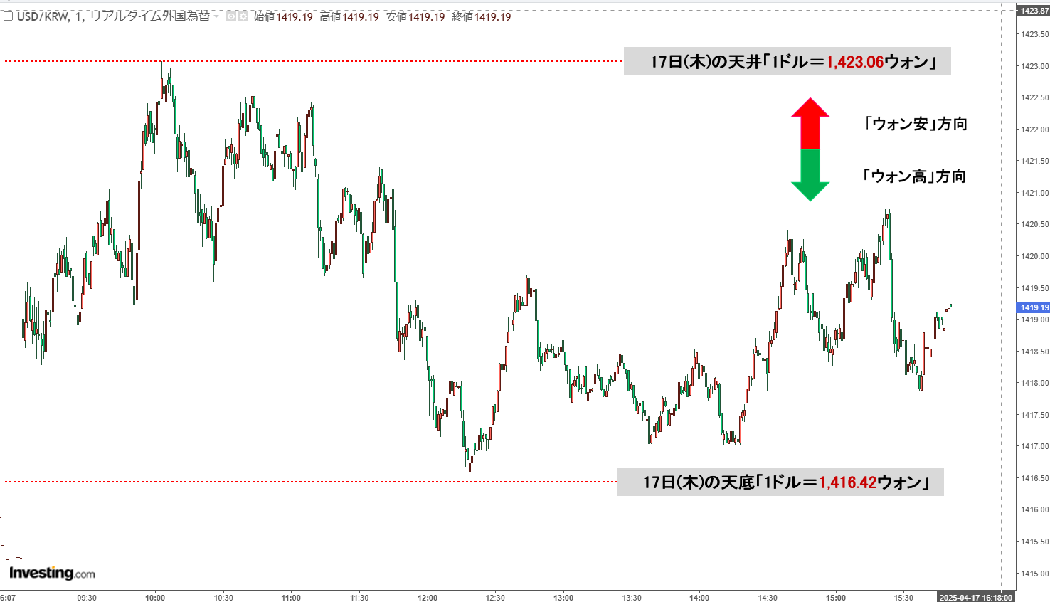 2025年04月18日(金)の市場が開きました。10:00現在、ドルウォンのチャートは以下のようになっています(チャートは『Investing.com』より引用)。上昇できなくて抑え込まれています。現在のところ「1ドル=1,421ウォン」近...