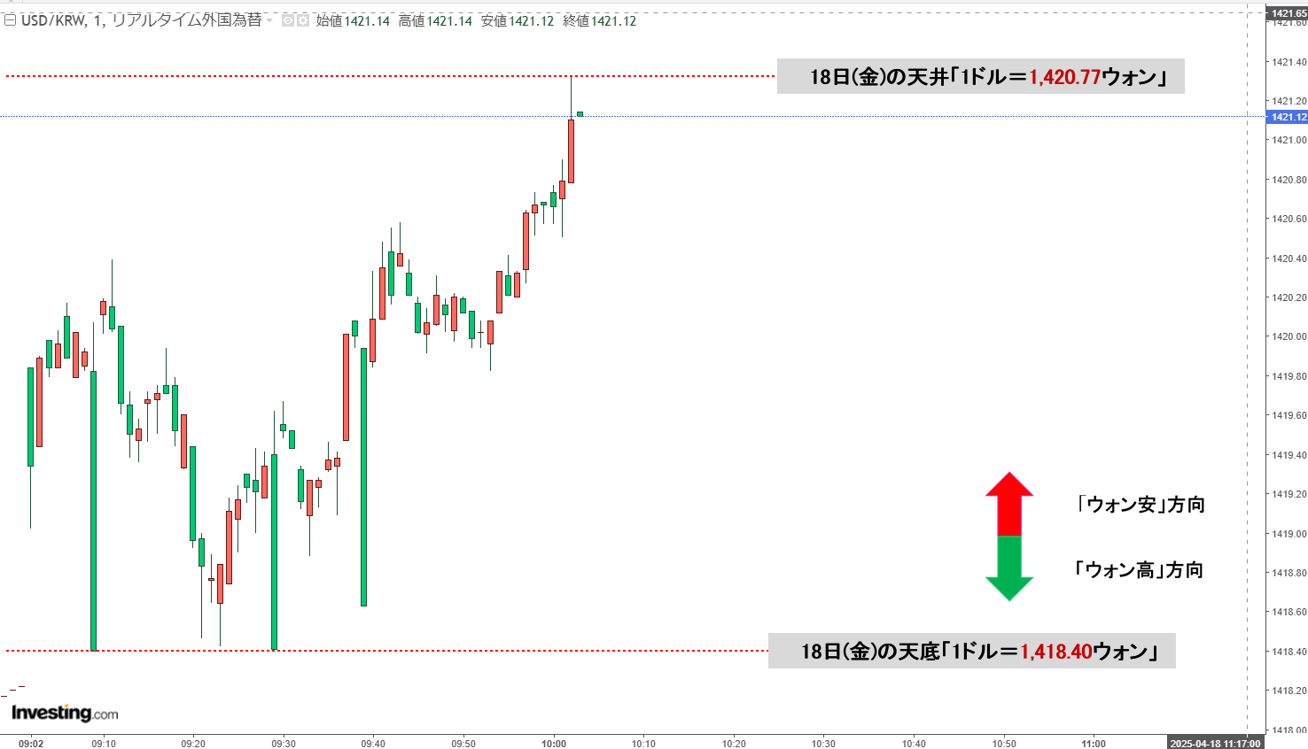 2025年04月18日(金)の市場が開きました。10:00現在、ドルウォンのチャートは以下のようになっています(チャートは『Investing.com』より引用)。
