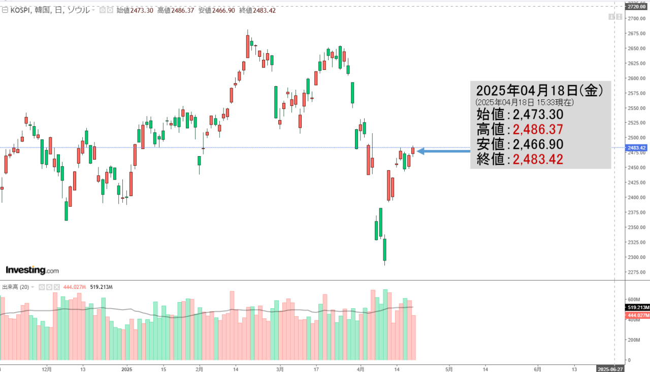 「韓国株式市場」04月21日(月)初動・KOSPI「2,486」ちょいアゲでコマ足