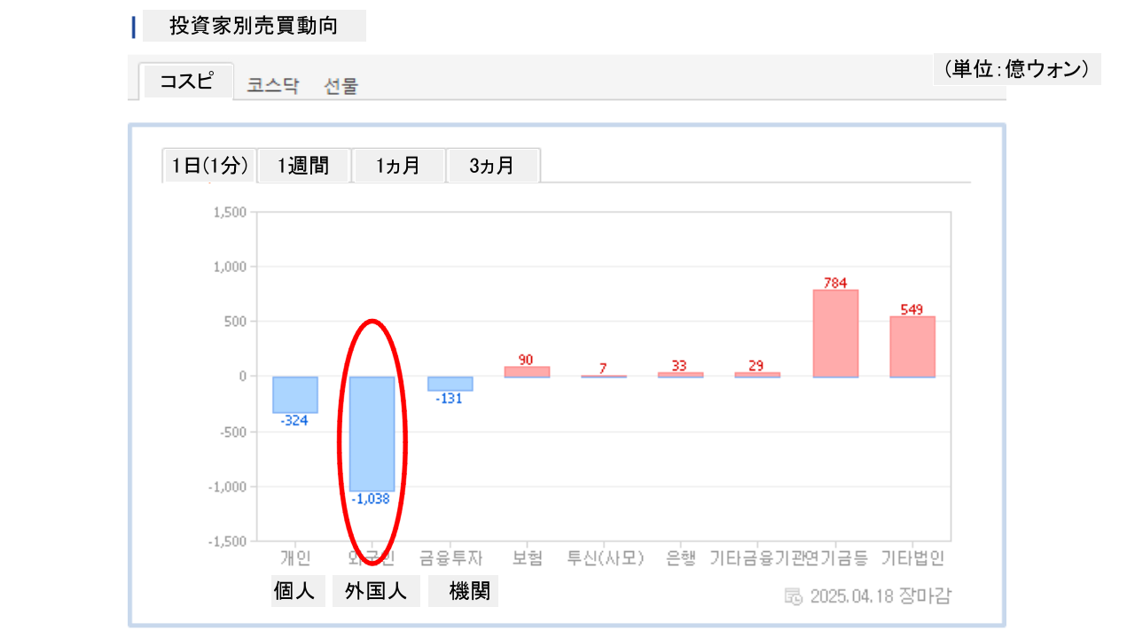 個人投資家は「324億ウォン」の売り越し。一方の外国人投資家は「1,038億ウォン」の売り越しです。