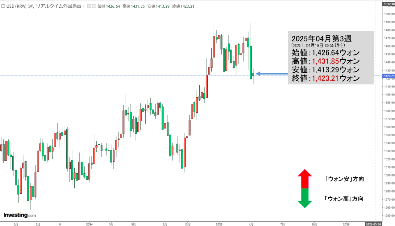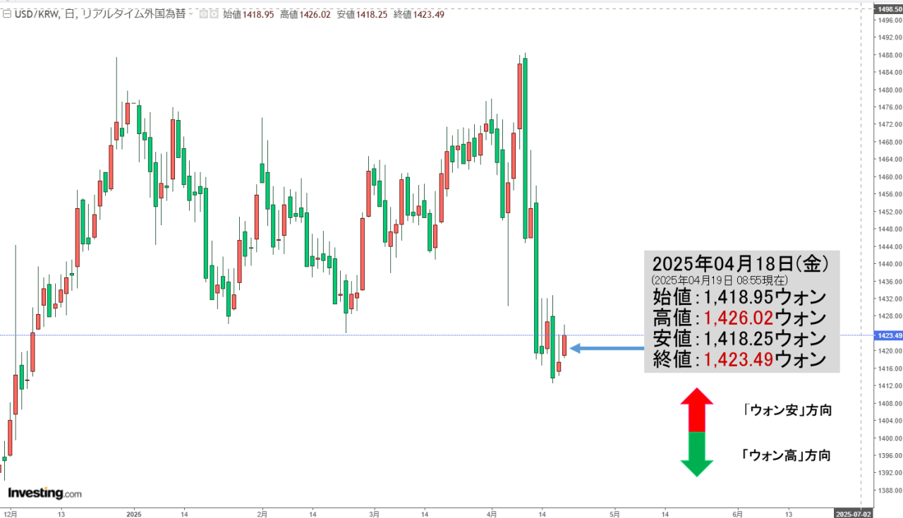 2025年04月19日 08:59現在、ドルウォンチャートは以下のようになっています(チャートは『Investing.com』より引用:以下同)。