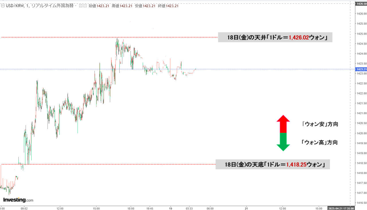 2025年04月21日(月)の市場が開きました。10:13現在、ドルウォンのチャートは以下のようになっています(チャートは『Investing.com』より引用)。下げて始まりましたが、現在のところ陽線。「1ドル=1,421ウォン」近辺の攻...