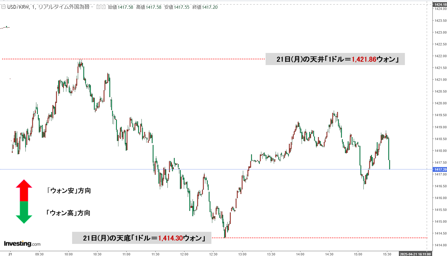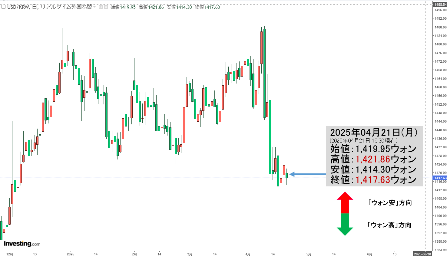 現在のところ「1ドル=1,417ウォン」近辺の攻防となっています。