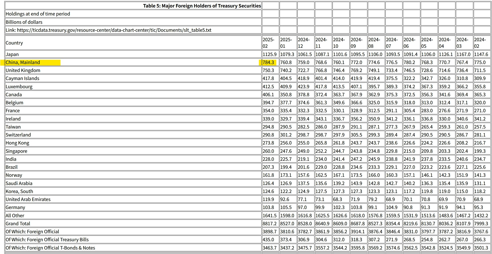 2025年04月には、中国が米国債を大量に売却したのではないのか――という憶測も出たのですが、統計の発表はまだ問題の箇所まで進んでいません。