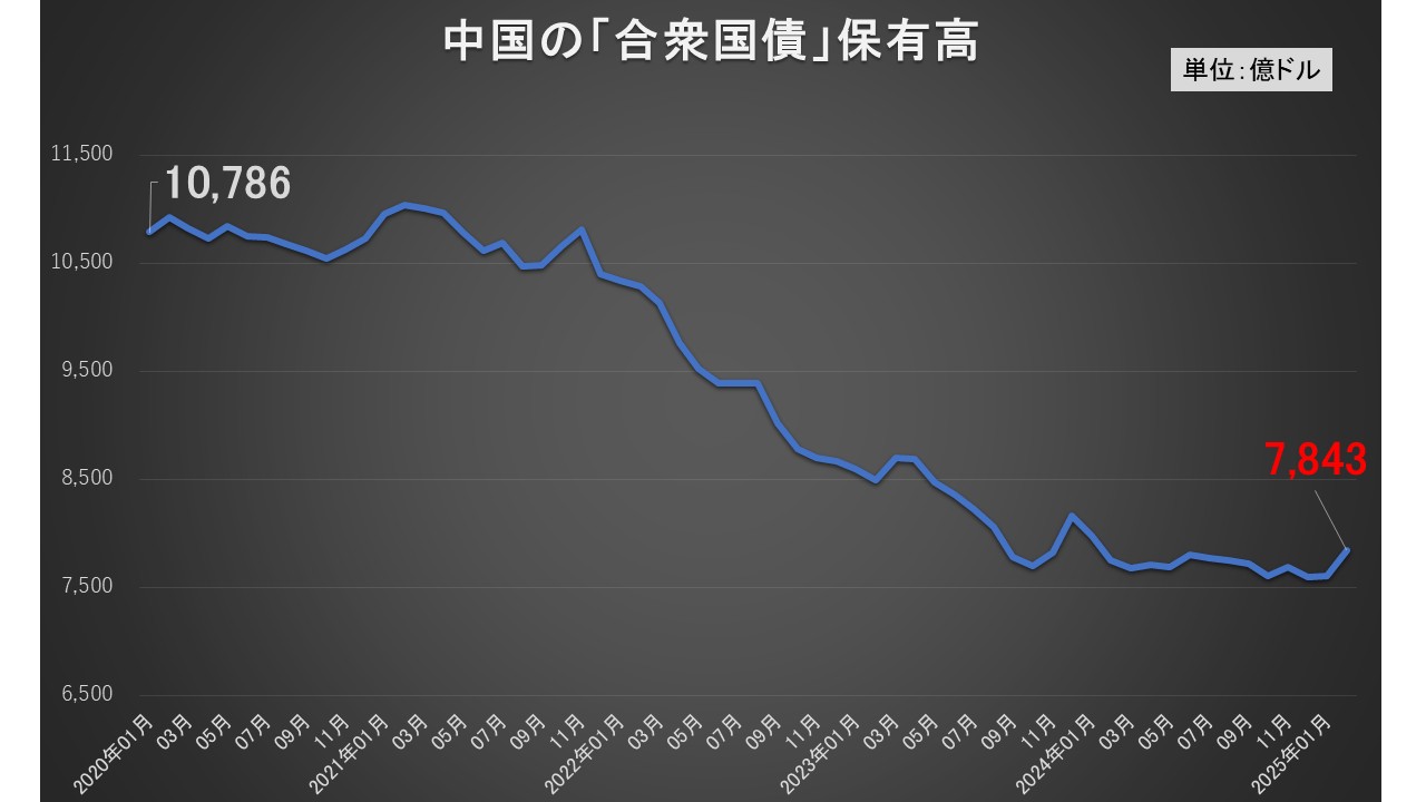 前月・2025年01月が「7,608億ドル」でしたから、当月は235億ドルも増やしました。