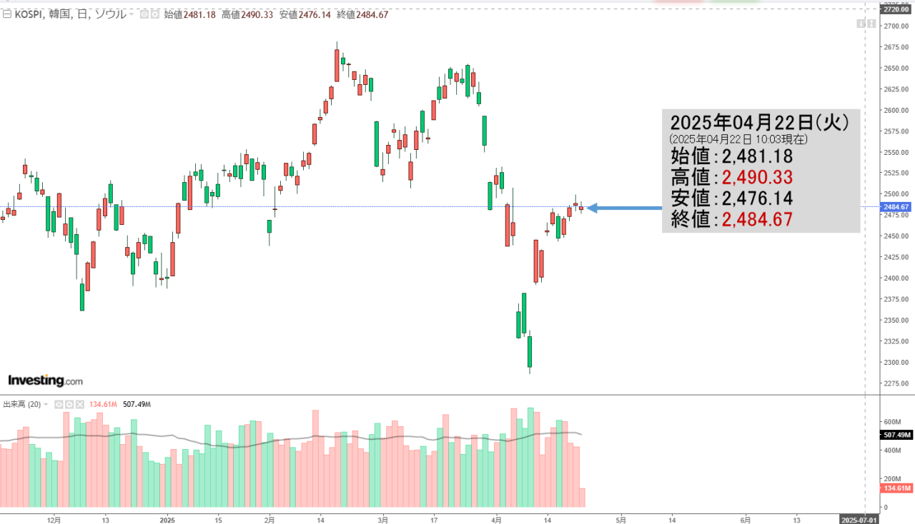 2025年04月22日(火)の韓国株式市場が締まりましたので以下の記事を制作いたしました。本記事と併せてお読み頂ければ幸いです。
