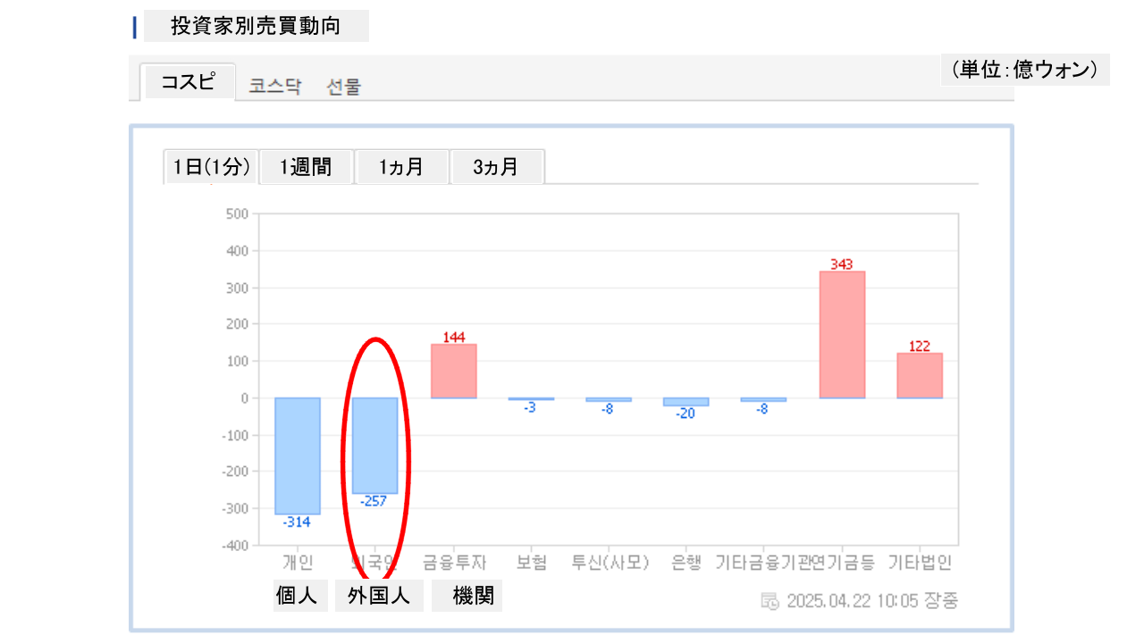 個人投資家は「314億ウォン」の売り越し。一方の外国人投資家は「257億ウォン」の売り越しです。