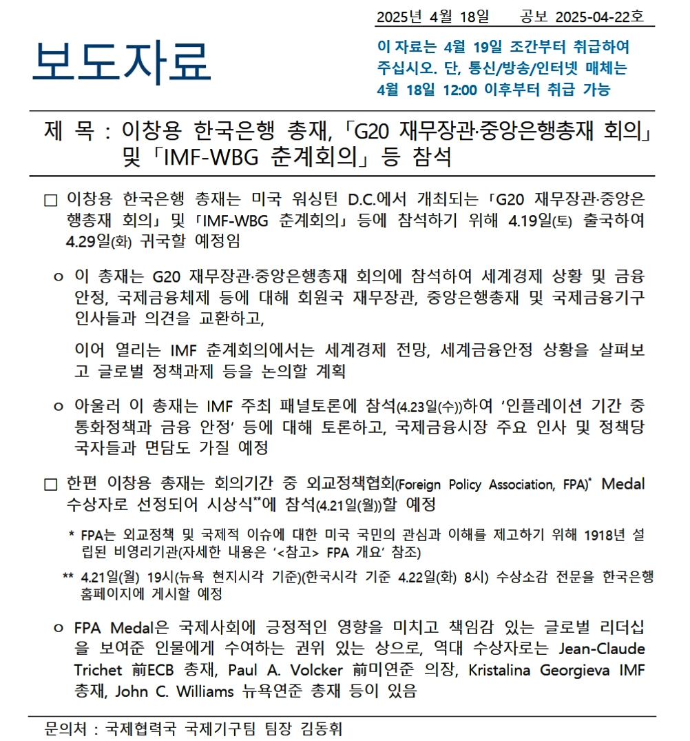 2025年04月18日、『韓国銀行』は李昌鏞(イ・チャンヨン)総裁のスケジュールについてのプレスリリースを出しました。