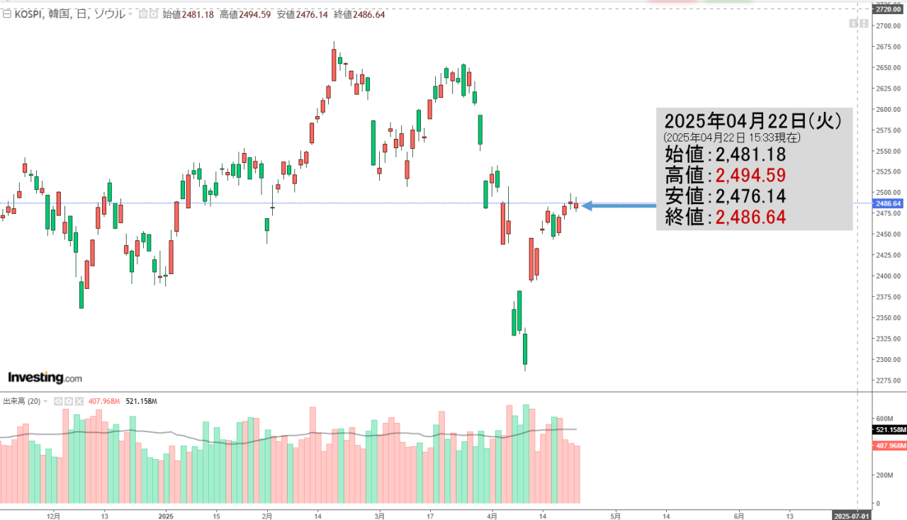 「韓国株式市場」04月23日(水)初動・KOSPI「2,513」ギャップアップして陰線。