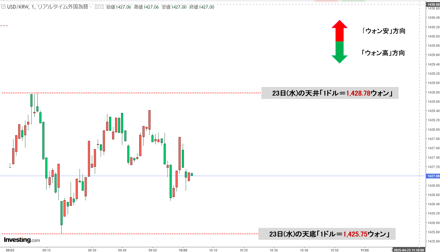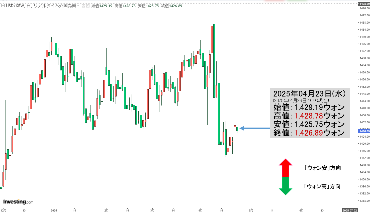 2025年04月23日(水)15:30現在、ドルウォンのチャートは以下のようになっています(チャートは『Investing.com』より引用)。陰線が伸びました。現在のところ「1ドル=1,421ウォン」近辺の攻防となっています。ローソク足1...
