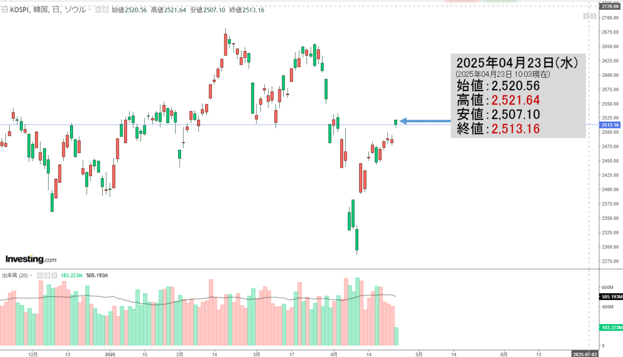 2025年04月23日(水)の韓国株式市場が開きました。10:03現在、KOSPI(韓国総合株価指数)のチャートは以下のようになっています(チャートは『Investing.com』より引用)。