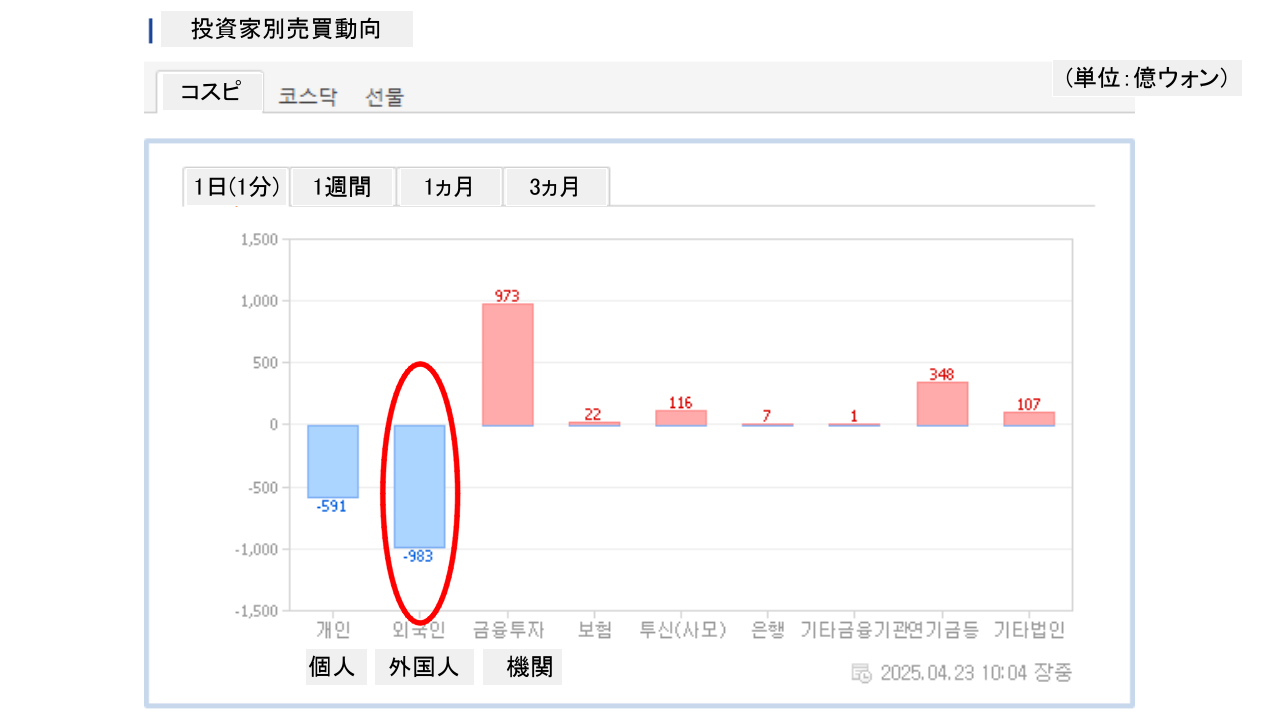 個人投資家は「591億ウォン」の売り越し。一方の外国人投資家は「983億ウォン」の売り越しです。