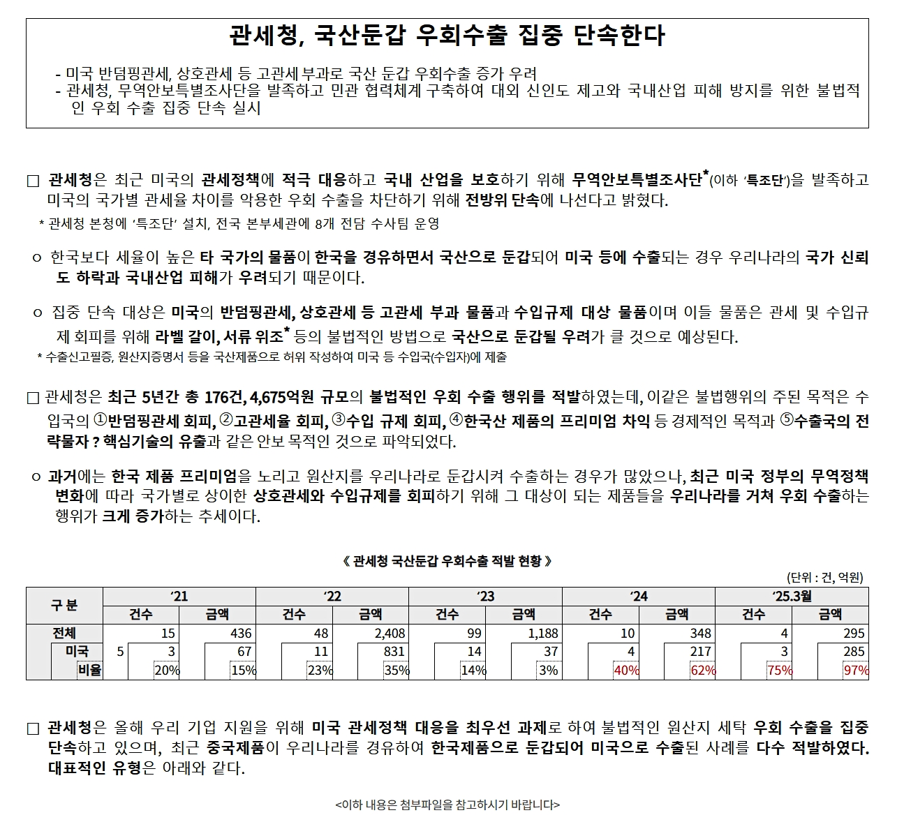 □関税庁は、最近の合衆国の関税政策に積極的に対応し、国内産業を保護するために「貿易違反特別調査団」(以下、特調団)を立ち上げ、合衆国の国家的関税措置を回避する目的の国産品の迂回輸出に対し、全国的な取り締まりを開始したと発表した。