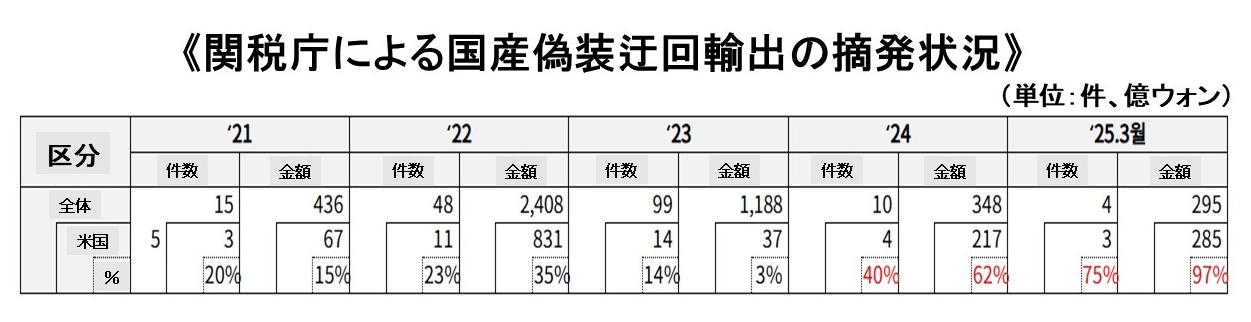 □関税庁は、今年もわが国企業の支援のため、米国の関税政策に対する輸出制裁や報復措置を避けるため、原産地偽装による不法輸出を集中的に取り締まっており、最近の中国製品を韓国産と偽装して米国に輸出した事例が多数確認されている。