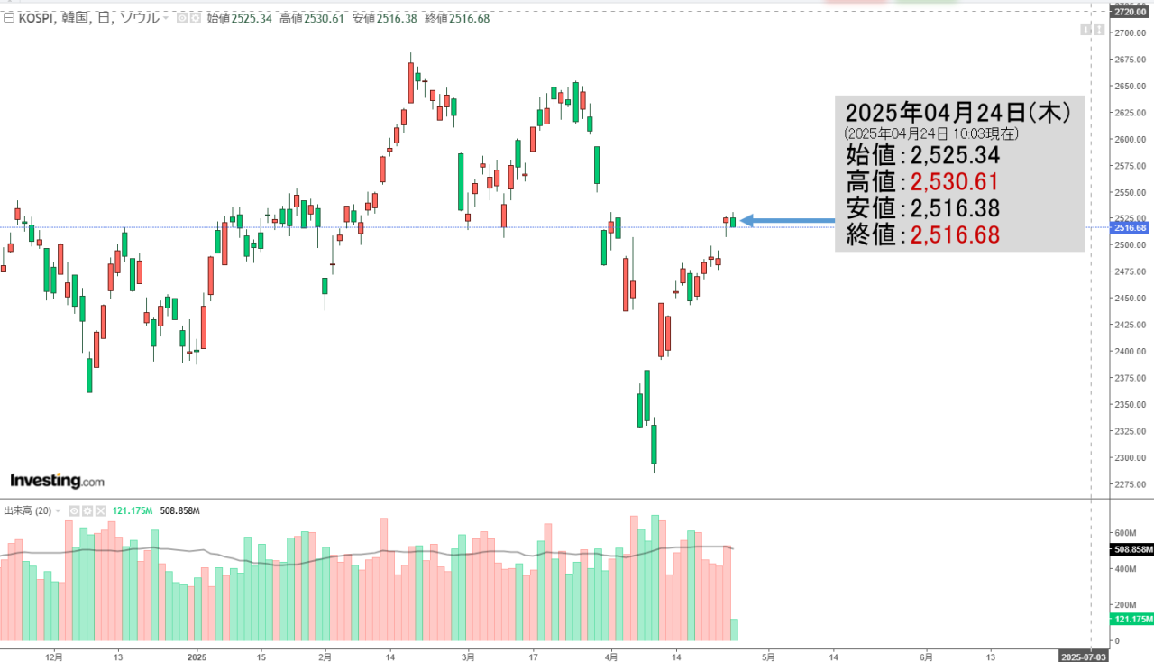 2025年04月24日(木)の韓国株式市場が締まりましたので以下の記事を制作いたしました。本記事と併せてお読み頂ければ幸いです。