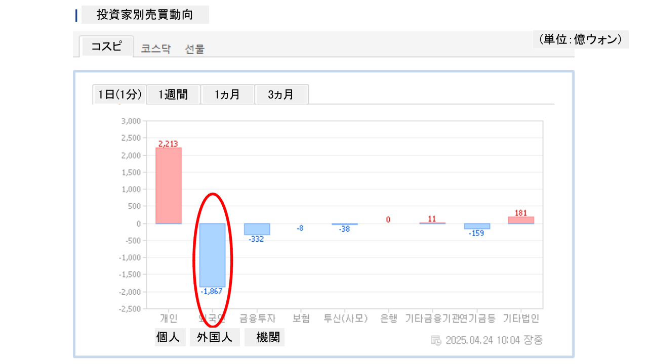 2025年04月24日(木)の韓国株式市場が締まりました。15:33現在、KOSPI(韓国総合株価指数)のチャートは以下のようになっています(チャートは『Investing.com』より引用)。投資家別売買動向は以下です。⇒データ引用元:『...