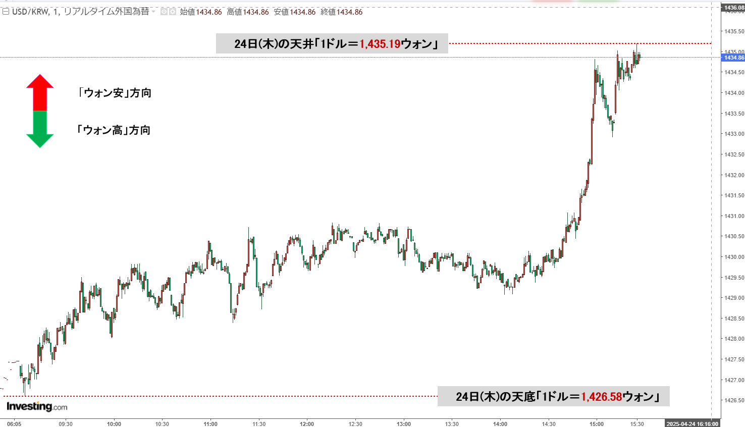 「ドルウォン」24日(木)夕刻・「1,434ウォン」陽線伸びる! 1,430を再突破