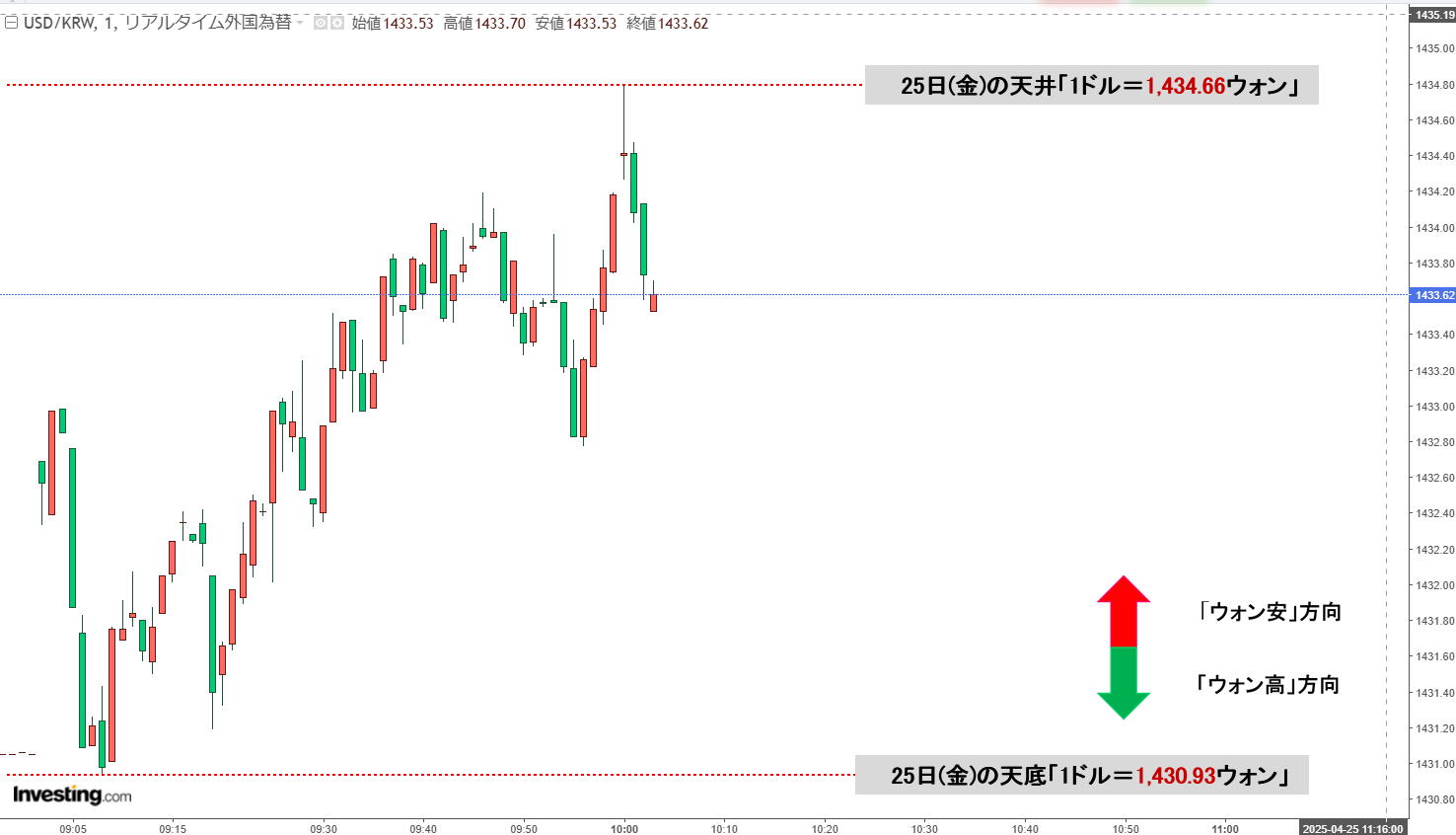 2025年04月25日(金)の市場が開きました。10:00現在、ドルウォンのチャートは以下のようになっています(チャートは『Investing.com』より引用)。