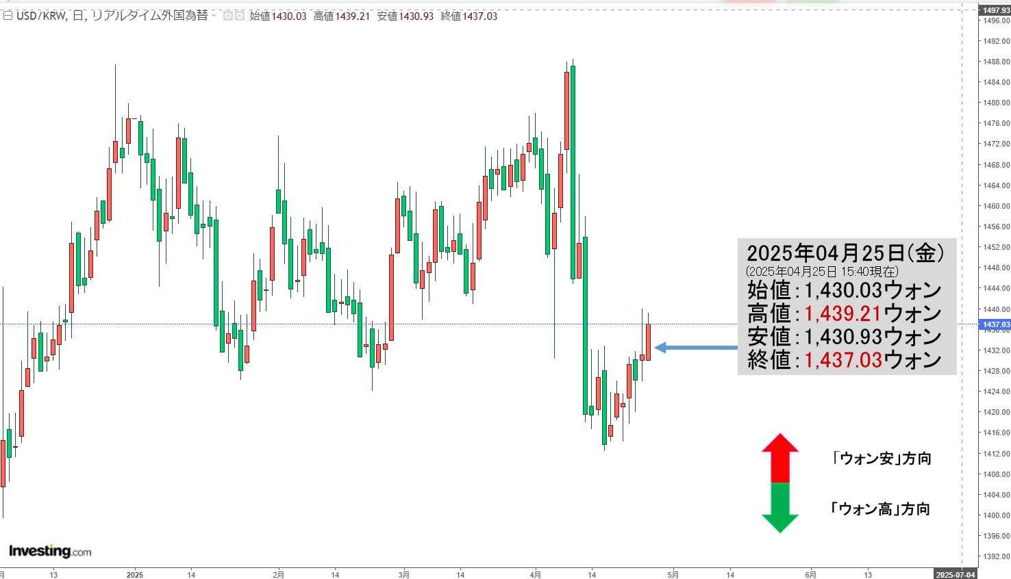 2025年04月25日(金)15:40現在、ドルウォンのチャートは以下のようになっています(チャートは『Investing.com』より引用)。
