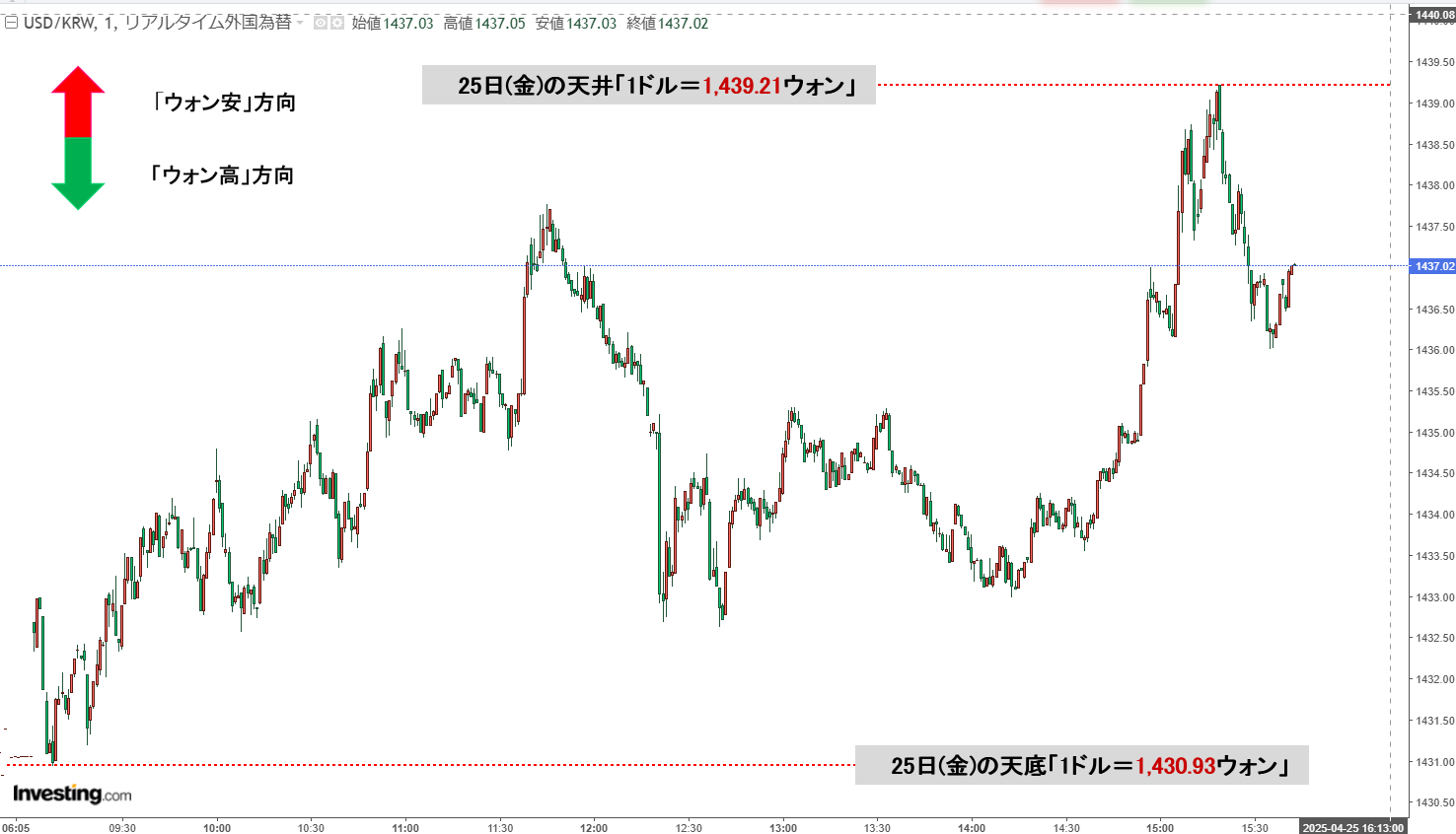 「ドルウォン」25日(金)決着!「1,437ウォン」ウォン安が進行。