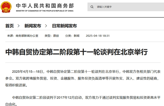 「中韓自由貿易協定」第2段階に関する第11回交渉を北京で開催。