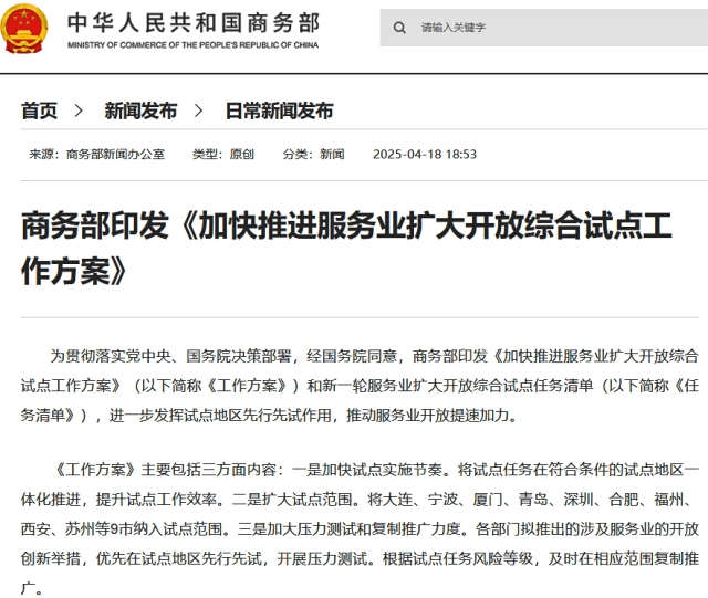 商務部が「サービス産業の開放拡大のための総合的試行計画の加速に関する作業計画」を公表。