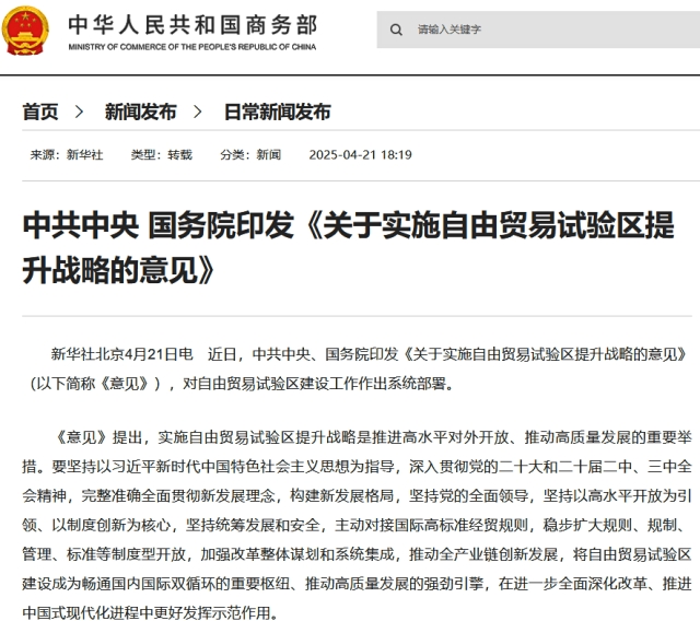 中国共産党中央委員会と国務院は「自由貿易試験区強化戦略の実施に関する意見」を公表。自由貿易試験区の建設に向けて体系的な取り決めを発表。