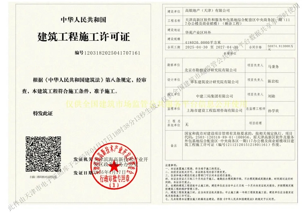 工事名称:天津濱海新区鉄件和服務外包基地供應配套区中央商務区(11小分区)綜合業務楼(測量1号樓)
