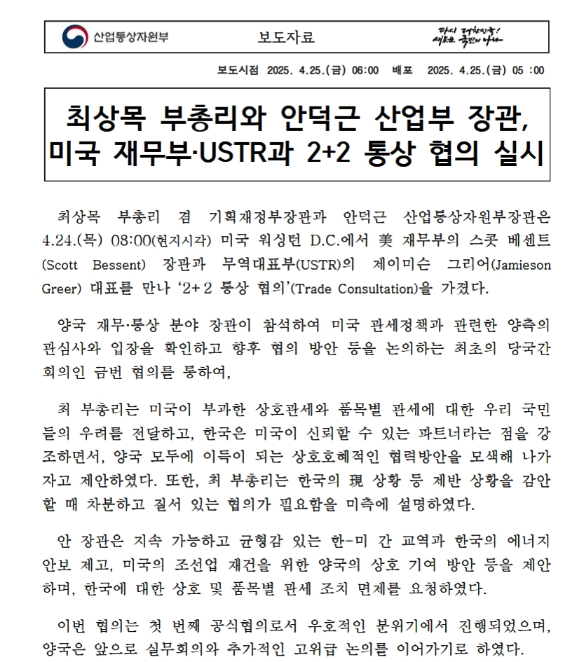 崔相穆(チェ・サンモク)副首相兼企画財政部長官と安徳根(アン・ドックン)産業通商資源部長官は、04月24日(木)08:00(現地時間)アメリカ合衆国ワシントンD.C.において、合衆国財務省のスコット・ベセント(Scott Bessent)長官および合衆国通商代表部(USTR)のジェイミソン・グリア(Jamieson Greer)代表と会談し、「2+2通商協議(Trade Consultation)」を行った。
