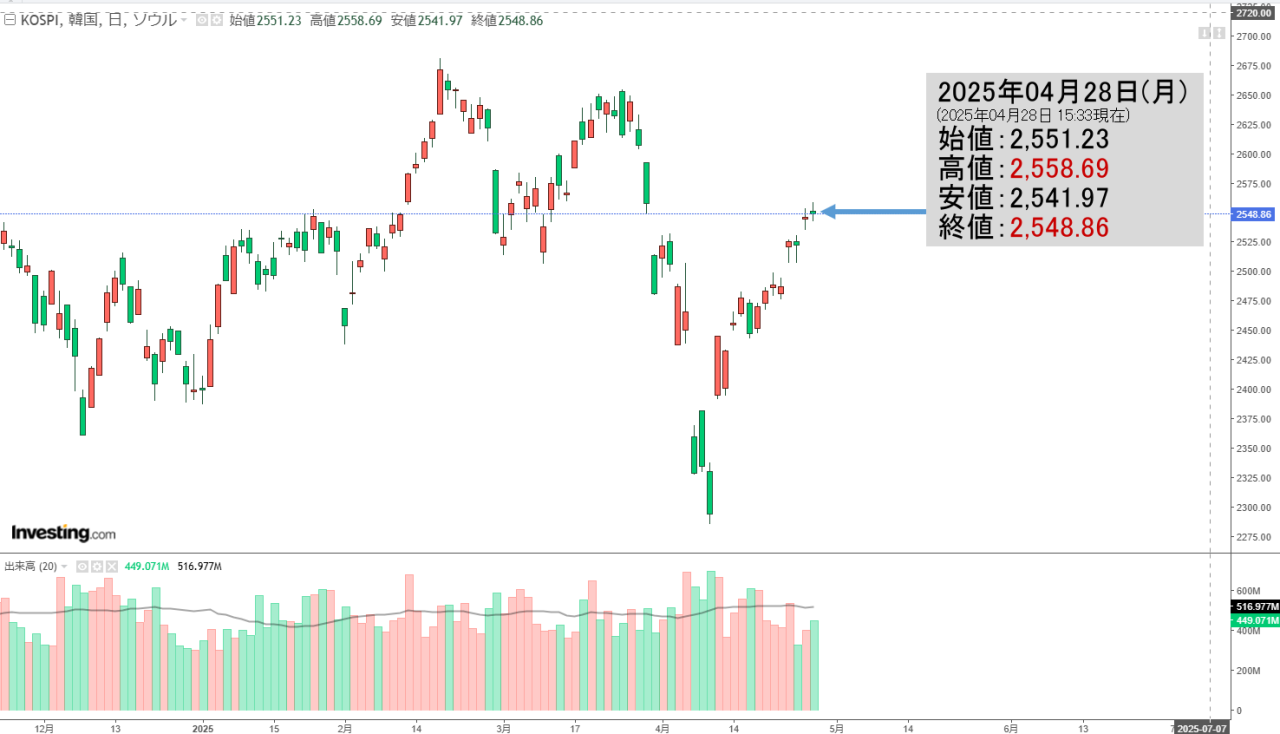 「韓国株式市場」04月29日(火)初動・KOSPI「2,552」ちょいアゲで陽線。
