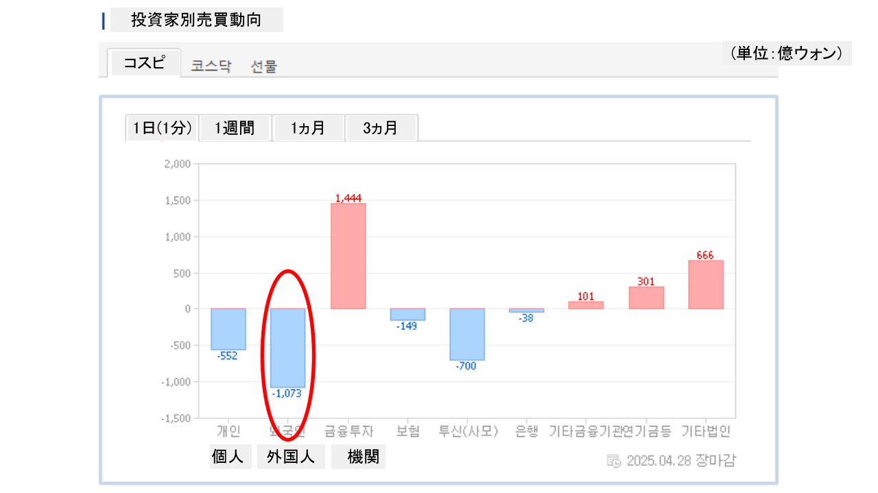 個人投資家は「552億ウォン」の売り越し。一方の外国人投資家は「1,073億ウォン」の売り越しです。