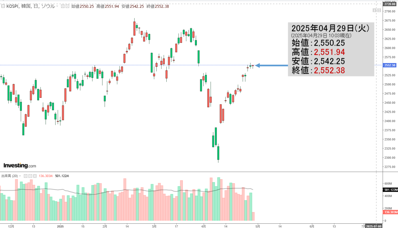 2025年04月29日(火)の韓国株式市場が締まりましたので以下の記事を制作いたしました。本記事と併せてお読み頂ければ幸いです。