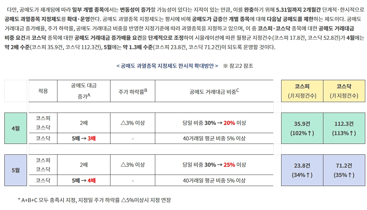 空売り取引が急増する特定銘柄に対し、翌日の空売りを制限する仕組みについて説明しています。⇒参照・引用元:『韓国 金融委員会』公式サイト「【報道参考】03月31日から公売度を全面再開します。 – 第1次臨時金融委員会開催・議論」