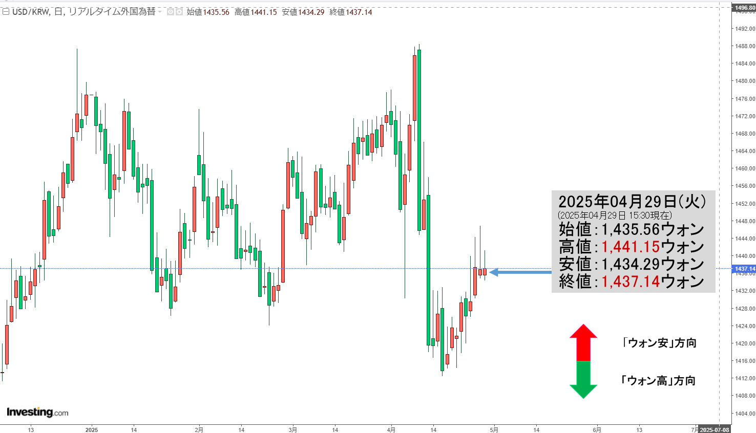 2025年04月30日(水)の市場が開きました。10:16現在、ドルウォンのチャートは以下のようになっています(チャートは『Investing.com』より引用)。現在のところ「1ドル=1,429ウォン」近辺の攻防となっています。前日も盛大...