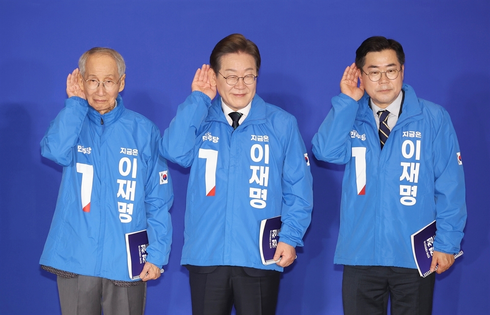 ↑李在明(イ・ジェミョン)さんを真ん中に挟んで、左がユン・ヨジュン常任総括選挙対策委員長、右が同職にして腰巾着筆頭の朴贊大(パク・チャンデ)さん。