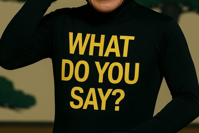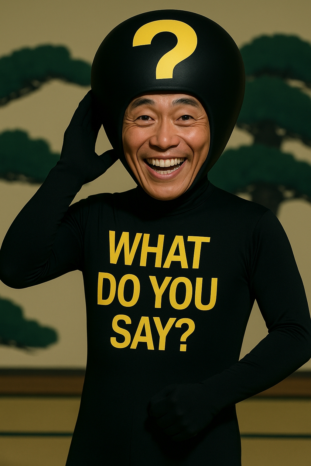 昭和のお笑い番組に登場した「ナンデスカマン」(WHAT DO YOU SAY?)のようでもあります。