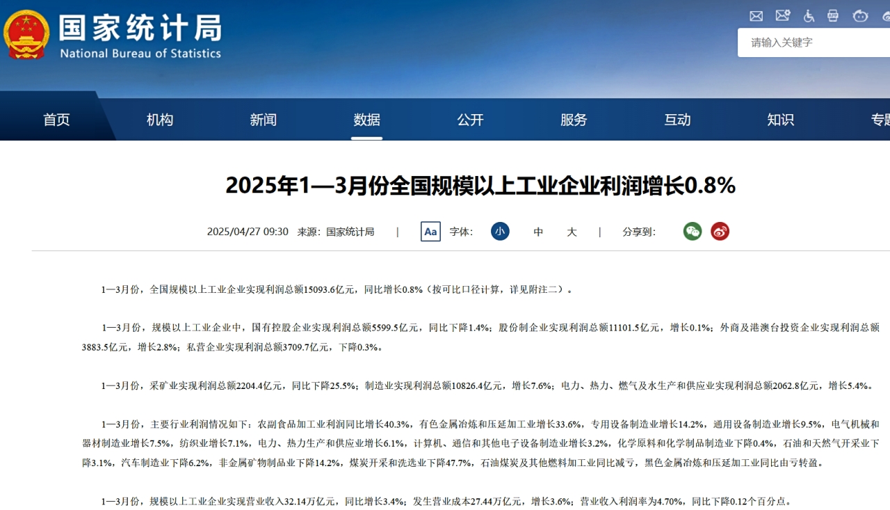 2025年04月27日、中国の国家統計局が「2025年1—3月份全国规模以上工业企业利润增长0.8%」というプレスリリースを出しました。