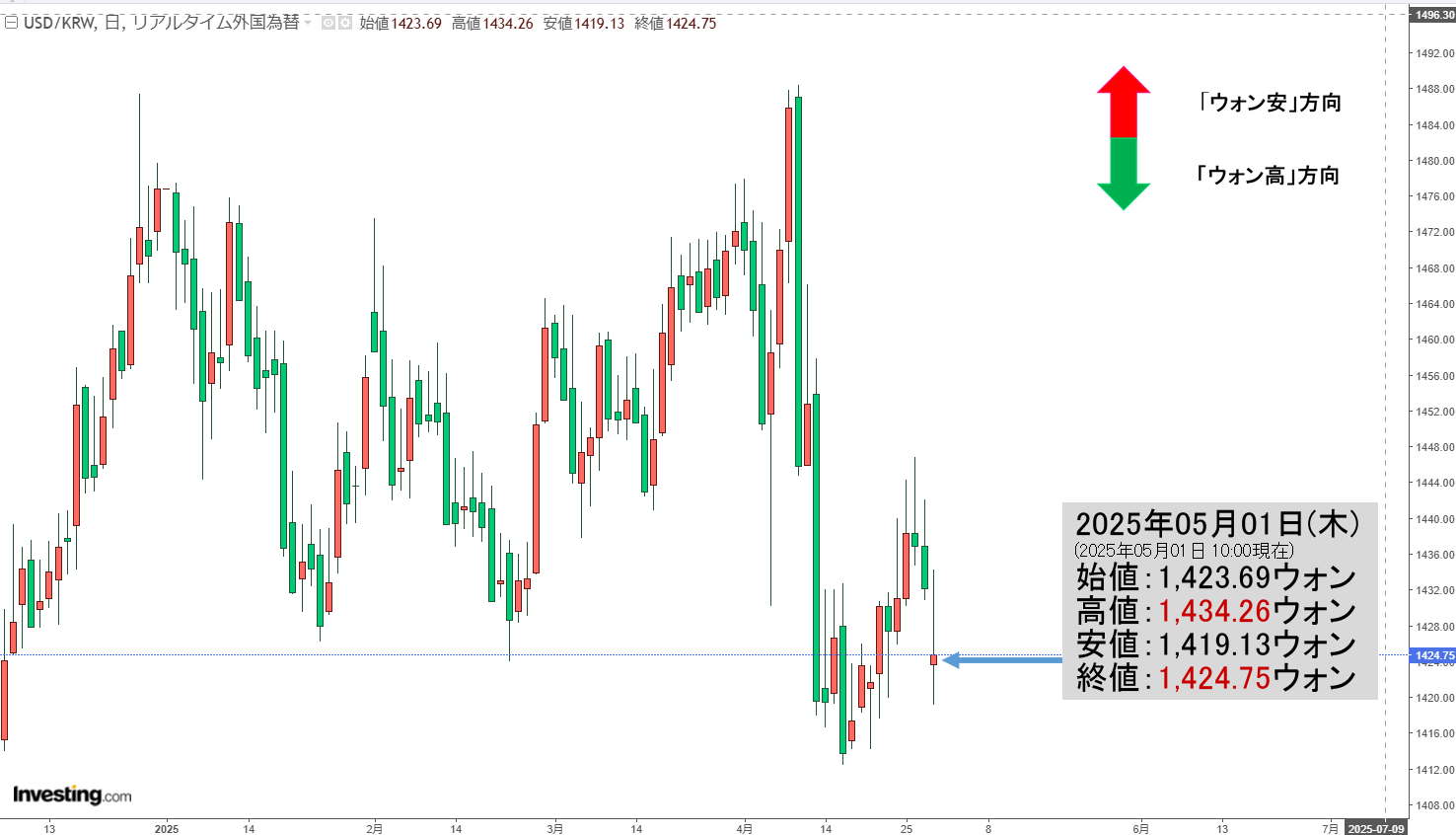 2025年05月01日(木)の市場が開きました。10:00現在、ドルウォンのチャートは以下のようになっています(チャートは『Investing.com』より引用)。