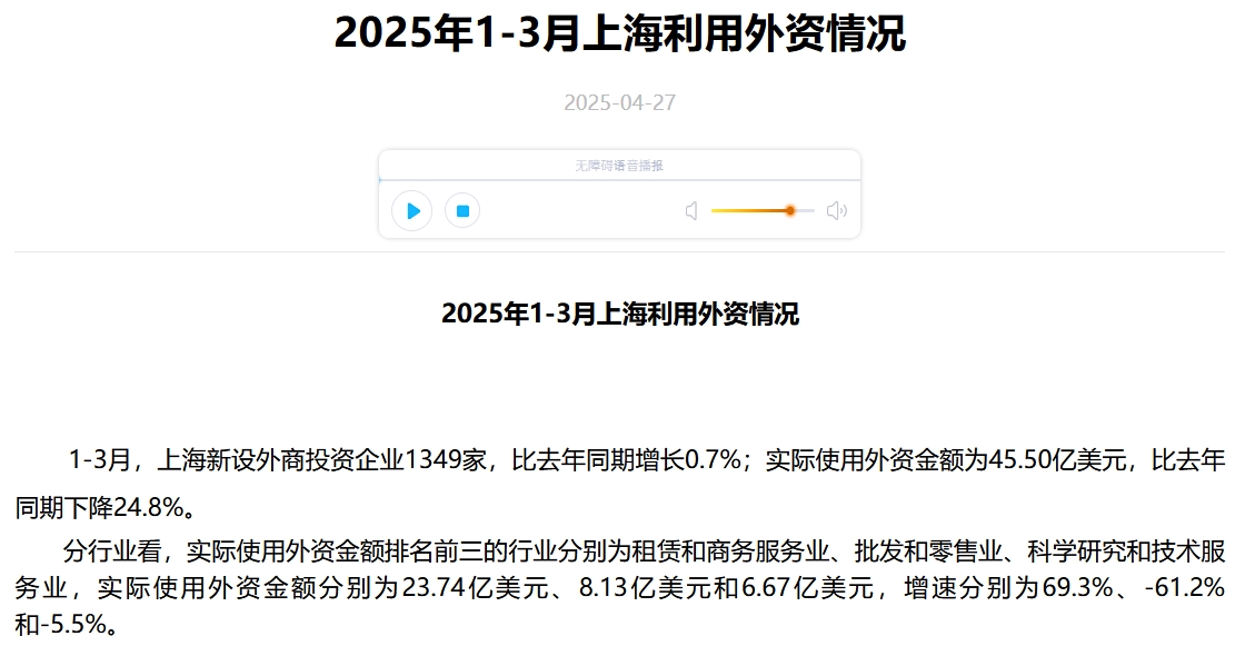 実際対中国の投資は減少を続けています。中国一の商都・上海の2025年第一四半期のデータが、2025年04月27日に上海市統計局から公開されていますので、確認してみましょう。